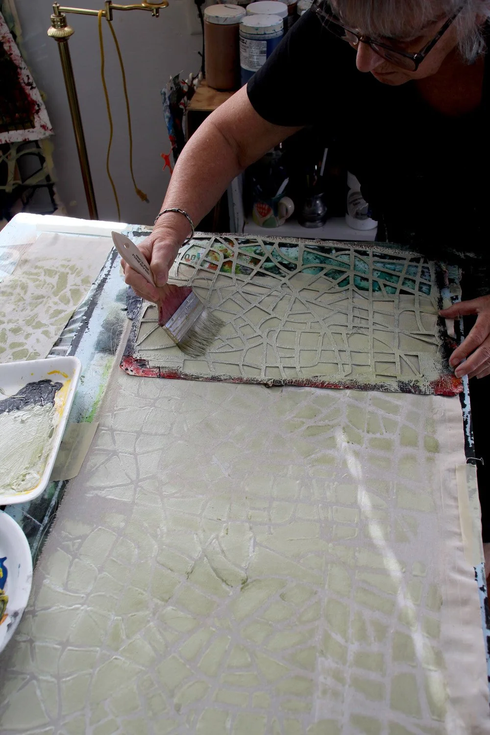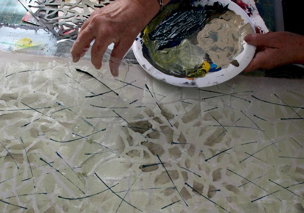 Next I worked with an all-over pattern stencil from my stash of well-loved hand-cut stencils. Again, I mixed the yellow + black to make olive, but I added that to a larger quantity of white.