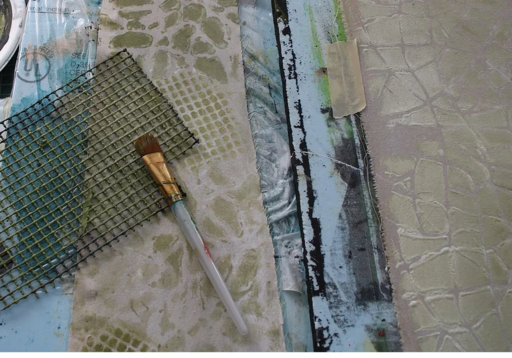 Here are some nice little squares added from a found object: this is a rubber mat intended as a shelf liner. This mix of larger shapes with smaller ones keeps things dynamic.