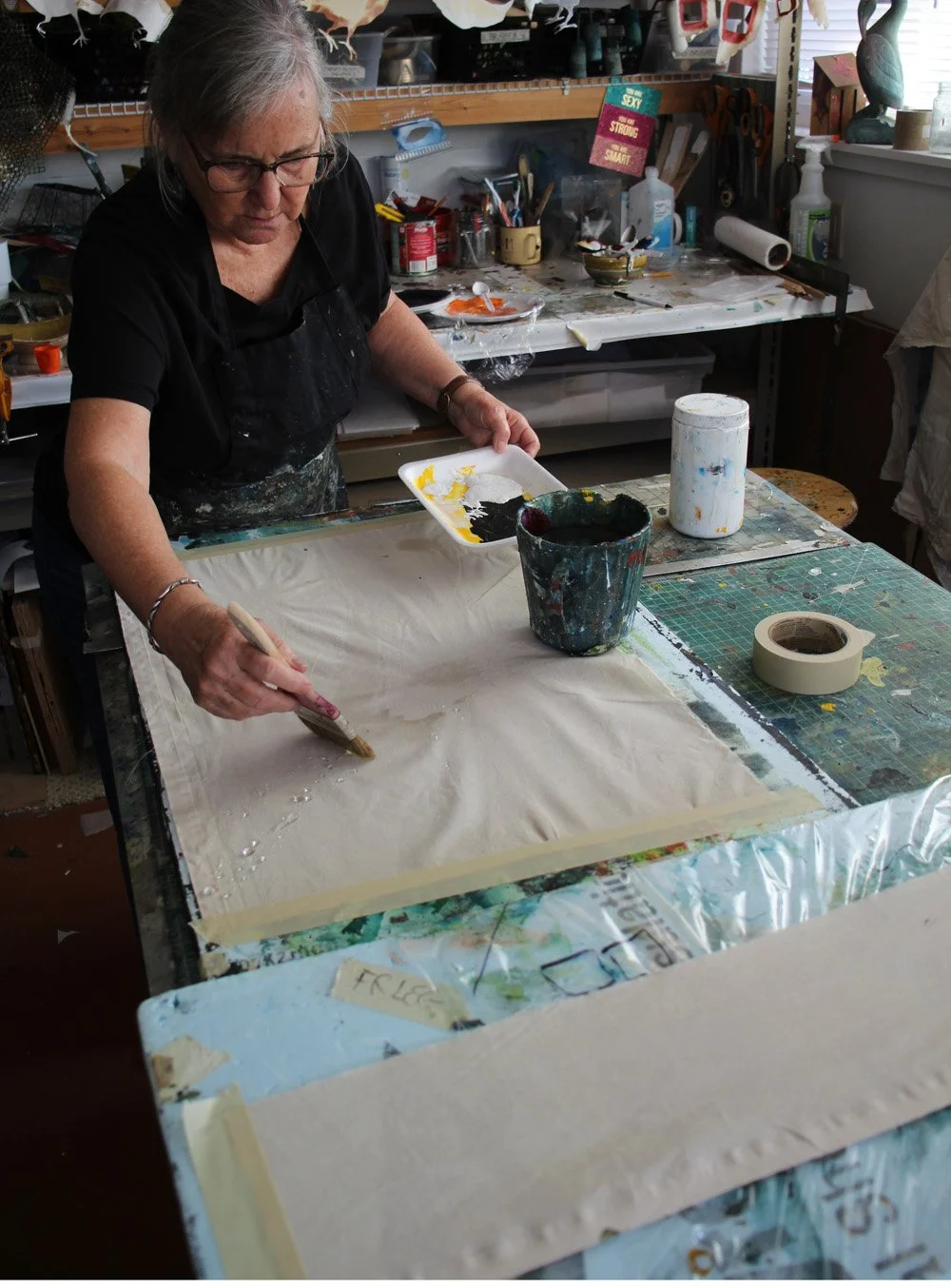To begin: I created the white yardage first. When I paint fabric, I like to tape it down to a working board so it doesn’t wrinkle up as the paint gets water and paint on it in varying degrees.
