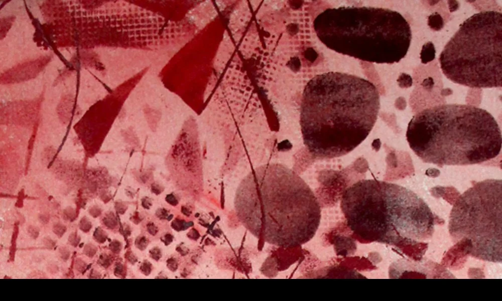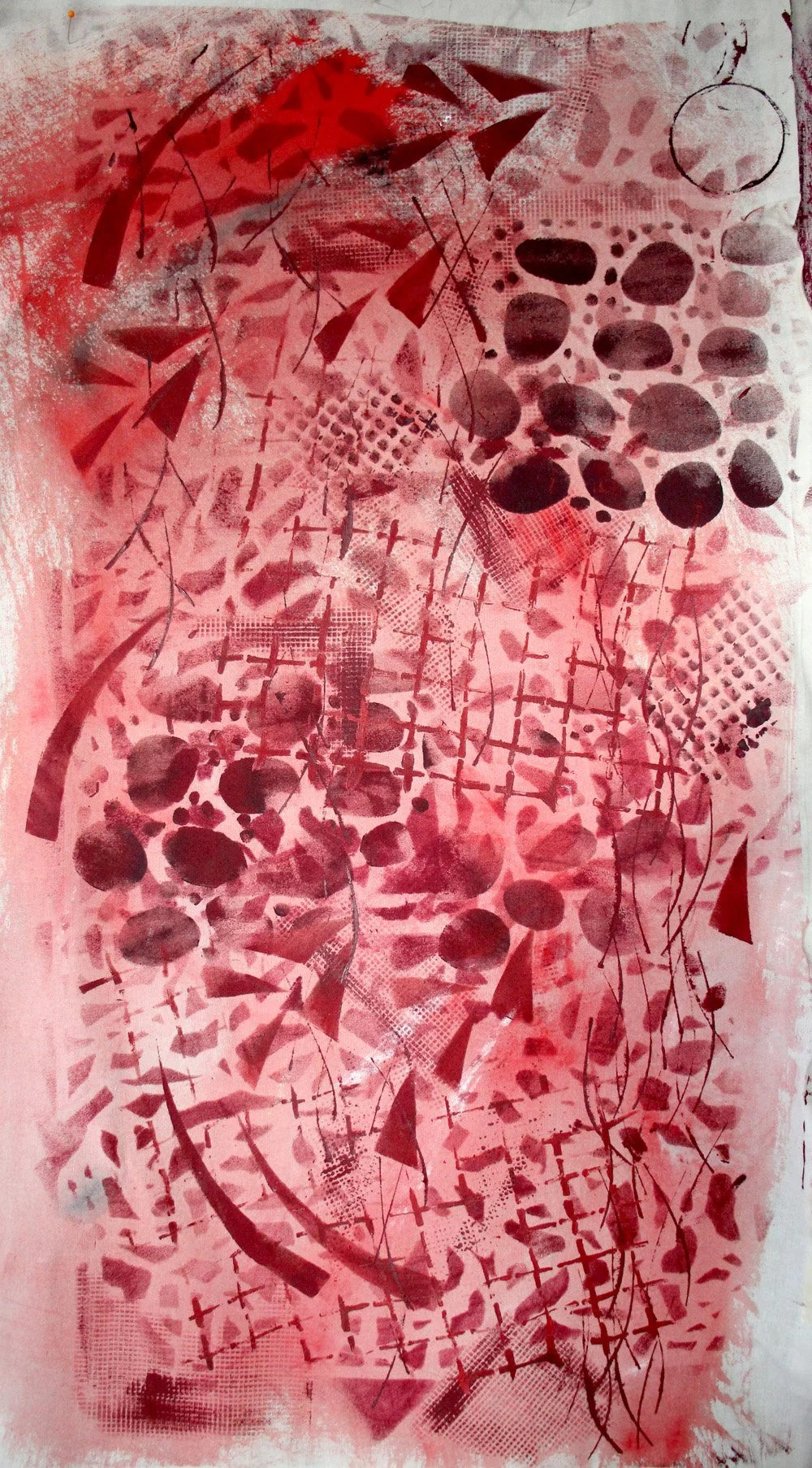 Now It was time to move onto the red fabric. I followed a similar process, working spontaneously. Least intense color in the background: a pale red wash. More intense colors on top: a mix of various mixed reds, in large and small shapes. (the piece in this photo is about 36”H.)