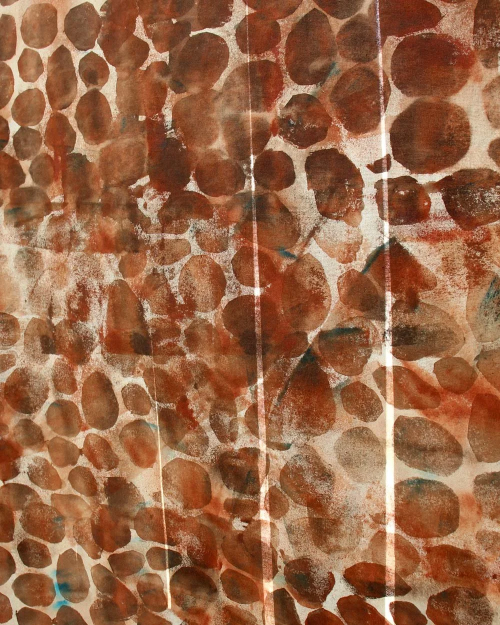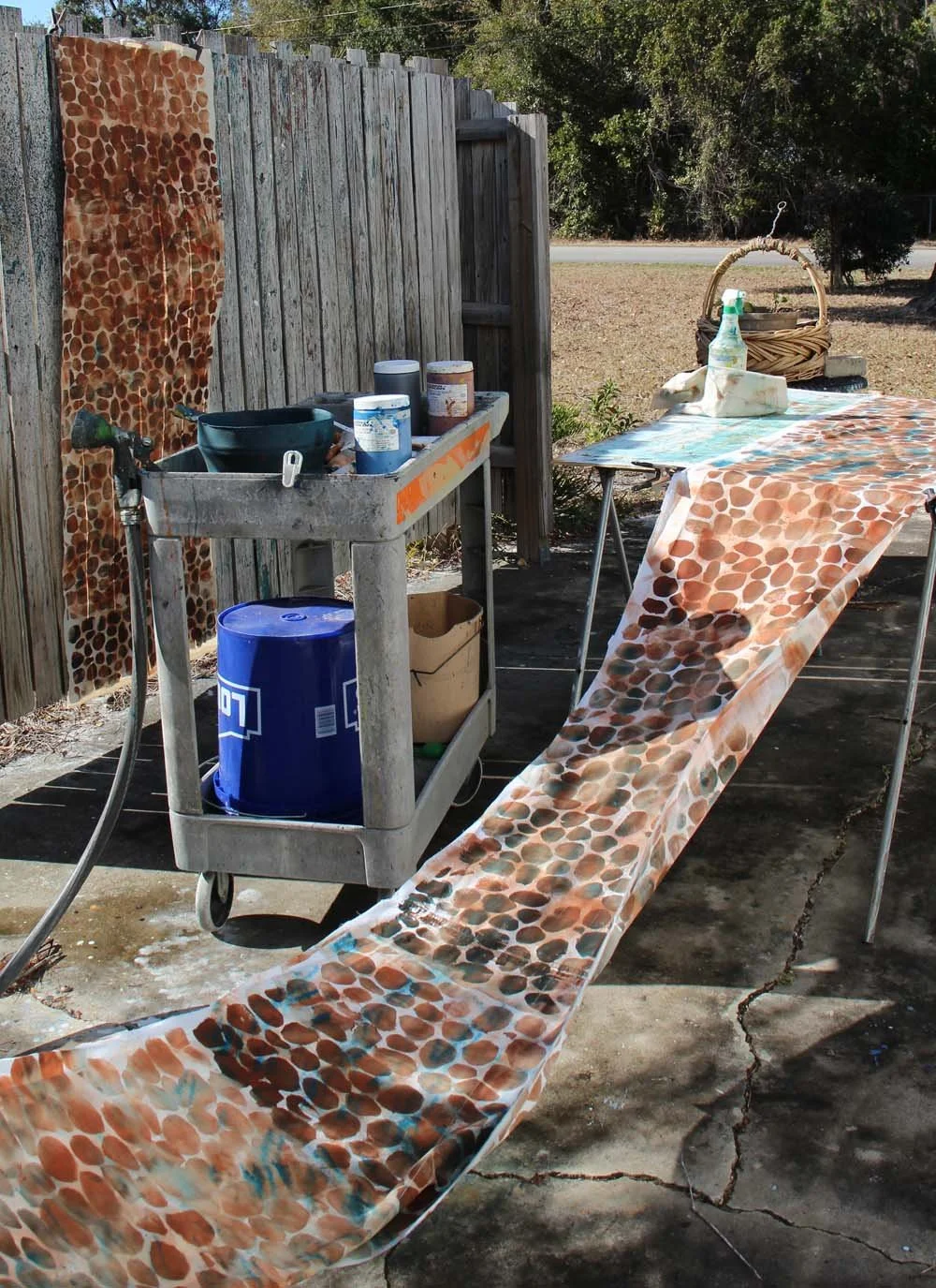 I think the rock shapes work as an all-over pattern. If you thought ahead even more, you could cut a stencil where organic shapes tuck into each other on each side fore less noticeable start-and-stop points. For this application I’m happy with the result.
