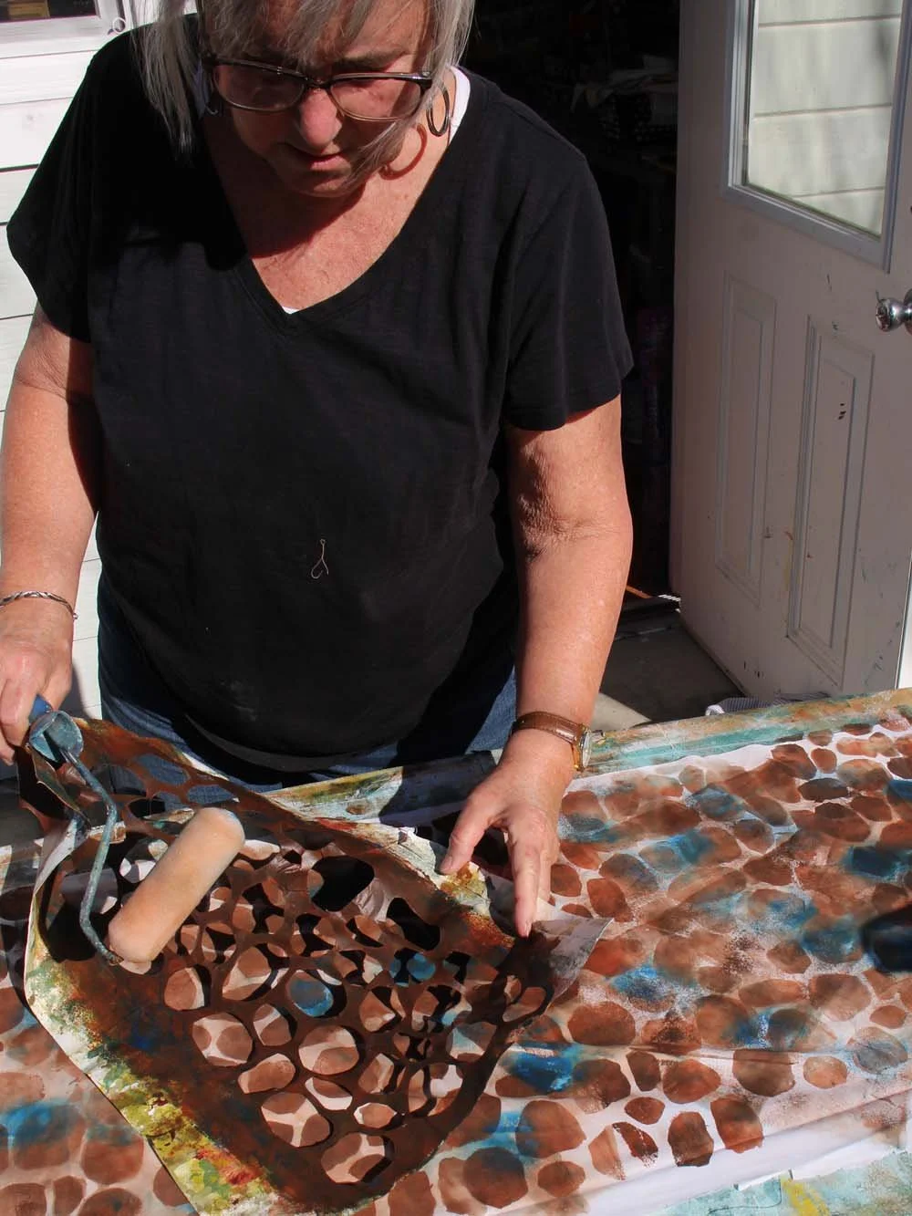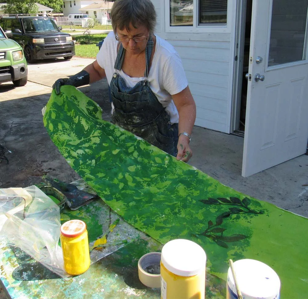 Notice that the stencil I’m holding is fairly small. But, using the print-move-print again method, I created a nice length of yardage pretty quickly.
