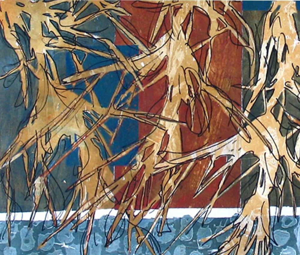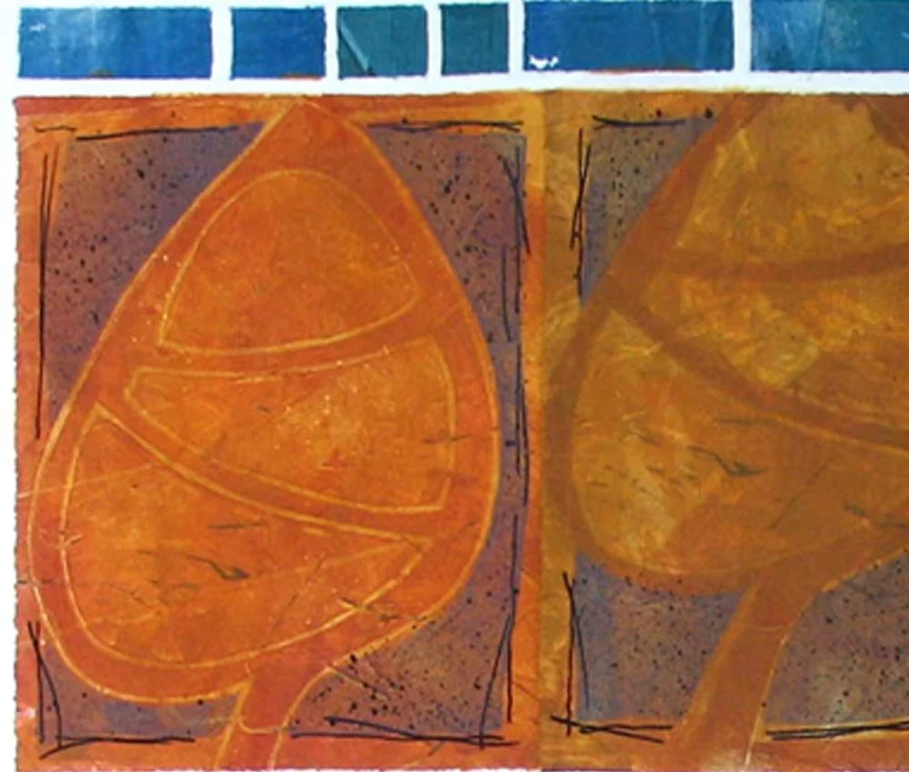 Finally, I rediscovered how much a simple palette speaks to me. All the colors I mixed in this work contain some portion of raw or burnt umber. The Cerulean Blue plus brown becomes more subtle. The Cadmium Red plus brown loses its brashness. And, because all the sections were printed as monotypes, there are slight variations in each patch of color. Nothing is too flat.