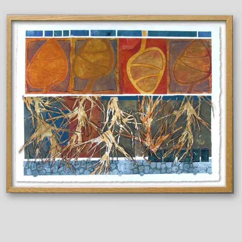 This is monotype printed rice paper, ripped and cut to size, collaged to 140# watercolor paper and mounted in a shadow box oak frame.