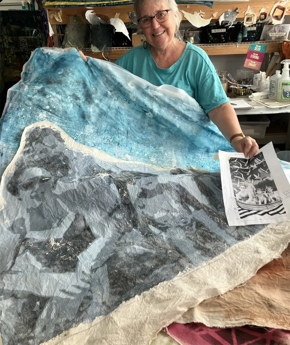From here to the completion, I’ll be working in order: step-by step. Based on the memory, expanded to a story that interests me, using the parts I have created, I am now ready to start building this piece of artwork. (A nice visitor to my studio during the tour photographed me with the quilt parts, as I told them the story of the piece.)