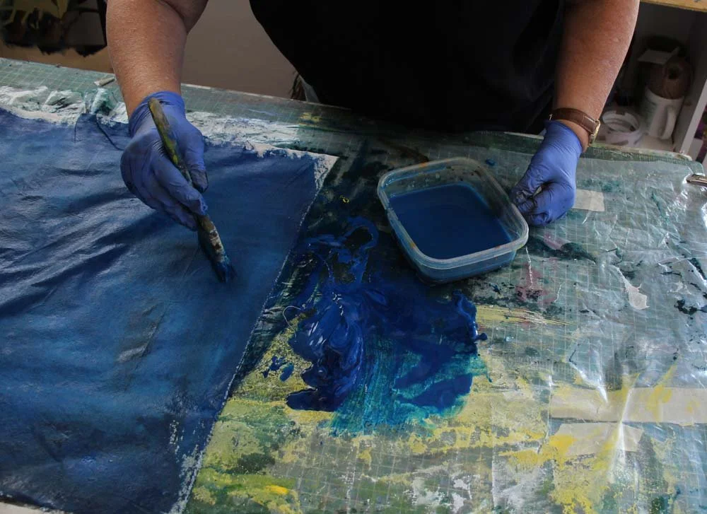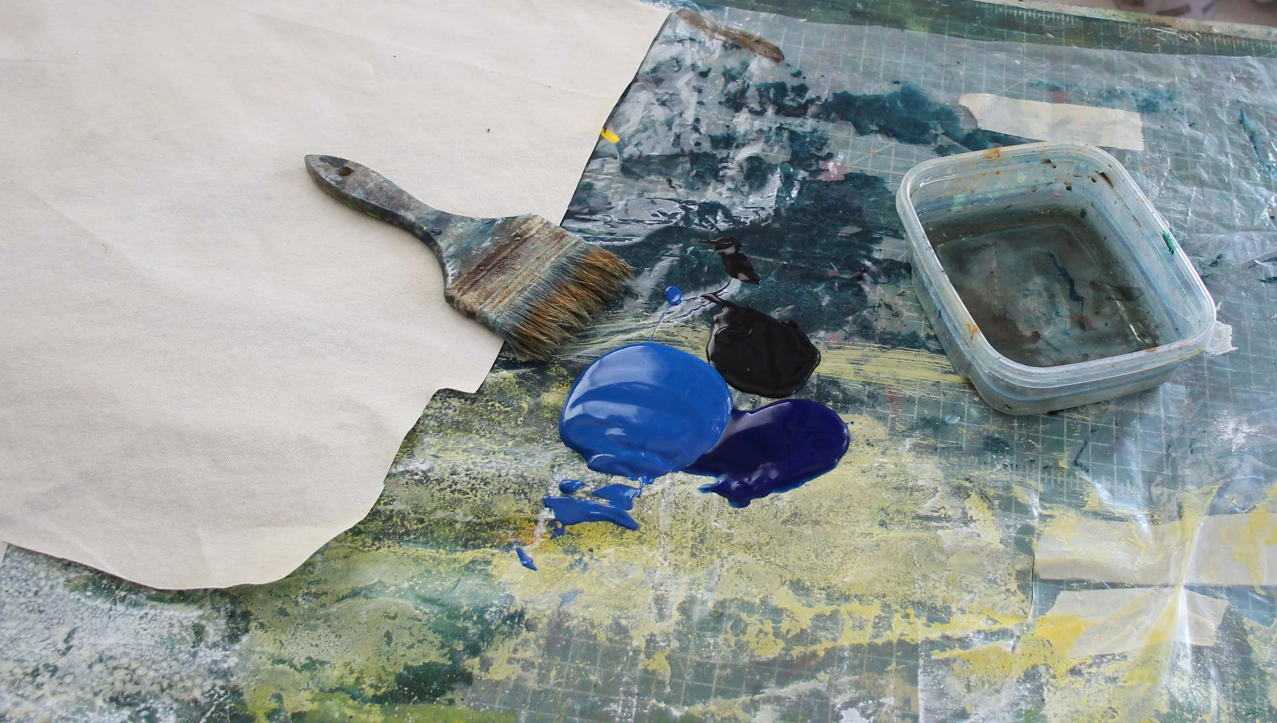 I prepped to paint some blue yardage. I am mixing cerulean blue + pthalo blue + black to create a deep, interesting blue. I mixed the colors right on my vinyl drop cloth, and painted the fabric loosely: brush dipped in water, then in the paints, then a little more water.