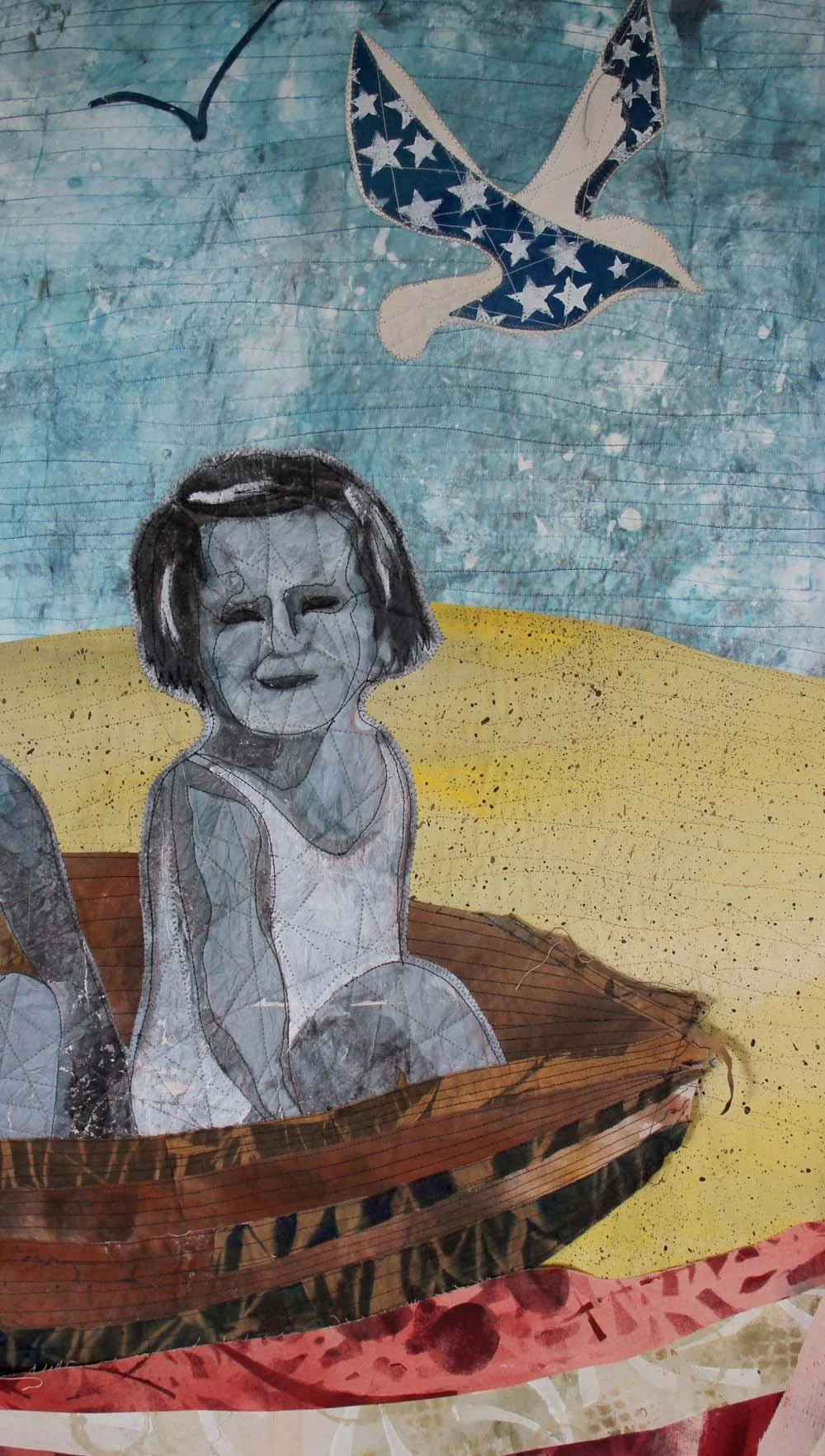 Already I am seeing contrasts that interest me. The sky is monotype printed on shear fabric—very light and watercolor-like. The sand is opaque muslin. The figures are photo transfers in black and white. And the boat and flag-stripe-waves are patterned muslin.