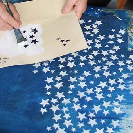 While that dried, I cut some star stencils. By cutting a small section of stars, with the spaces between them not in a straight line, I can stamp-and-repeat this patterns by tucking the stars into the blank space of the previous batch of stars.
