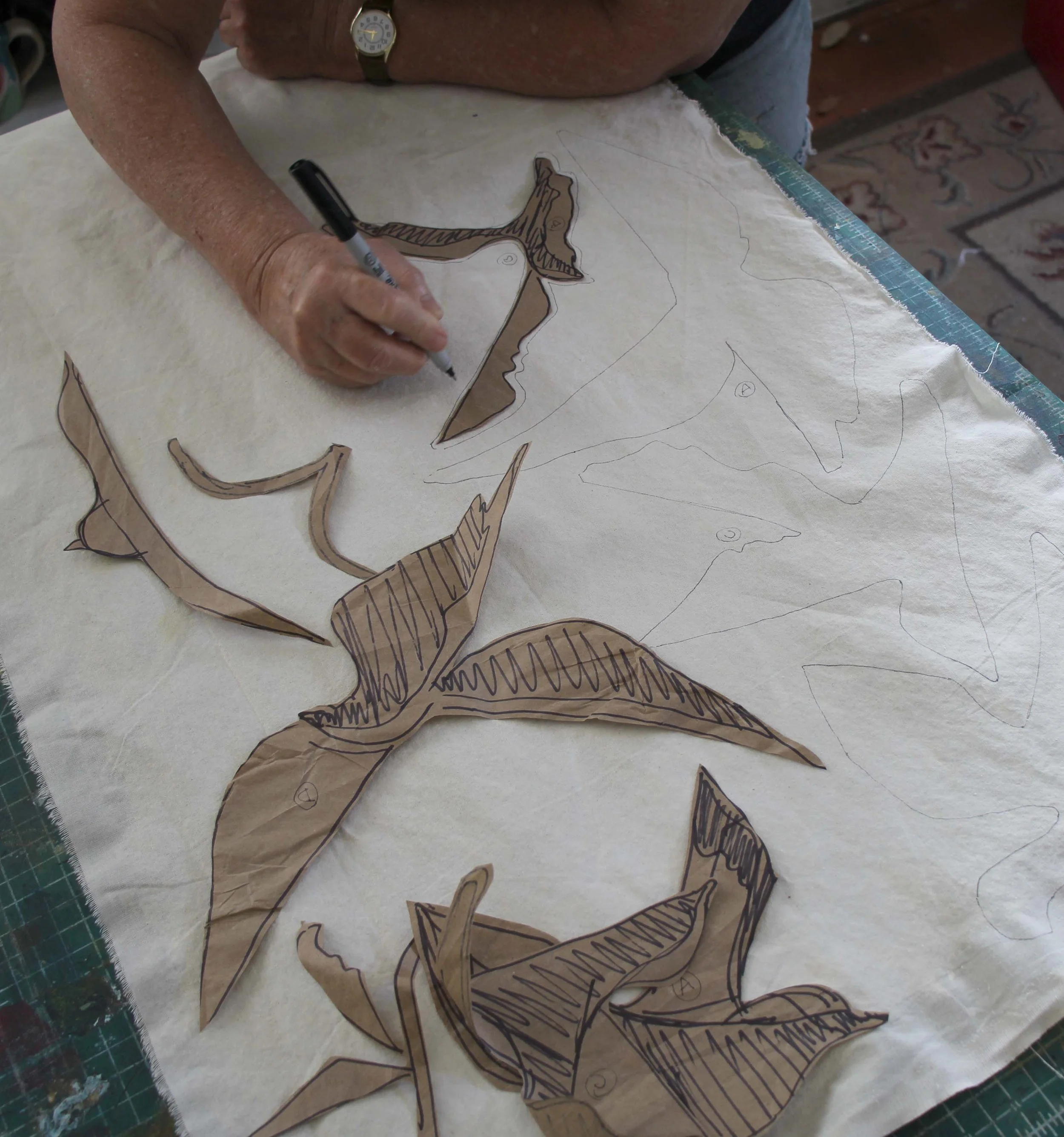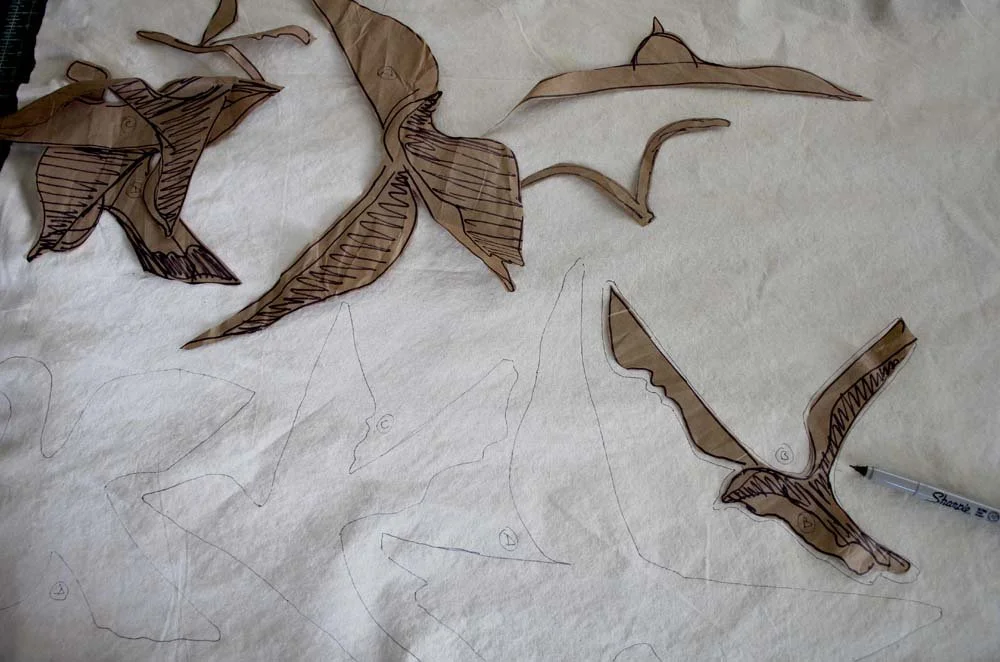 I drew the bird shapes onto muslin I had prepped with a wash of white latex paint and water. My plan was to put these in the sky as raw-edge appliqued shapes. So, my paper drawings are cutting patterns.